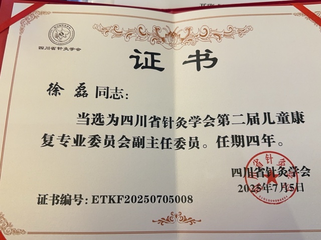 此外,在本届专委会换届选举这一核心议程中,徐磊院长凭借其在儿童康复领域卓越的学术贡献和广泛的行业影响力,成功当选为四川省针灸学会第二届儿童康复专业委员会副主任委员。这一重要职务不仅是对其个人专业能力的高度认可,也充分体现了西南儿童康复医院在省内乃至全国儿童康复领域的学术地位与行业引领力。